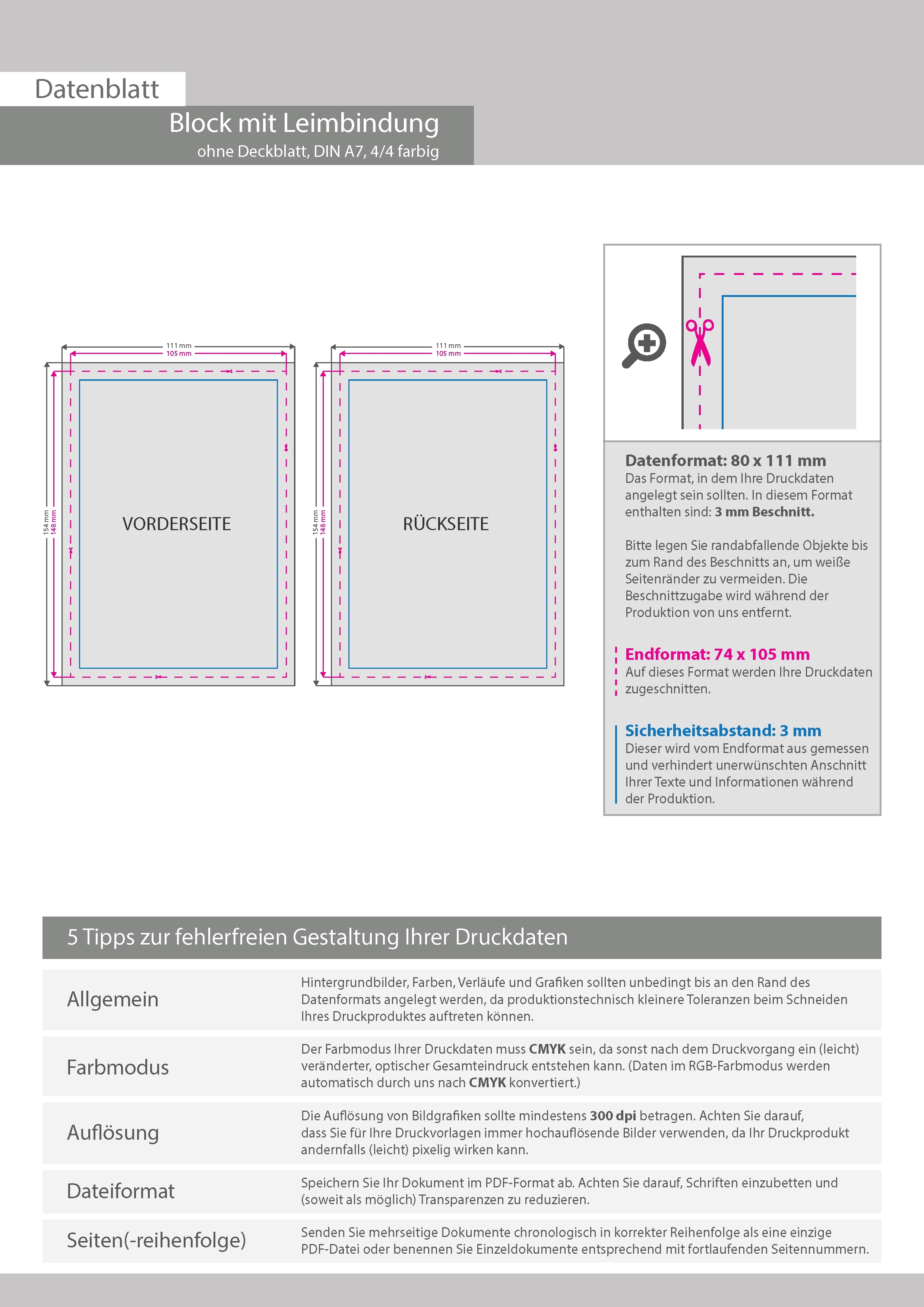Block mit Leimbindung, DIN A7, 100 Blatt, 4/4 farbig beidseitig bedruckt