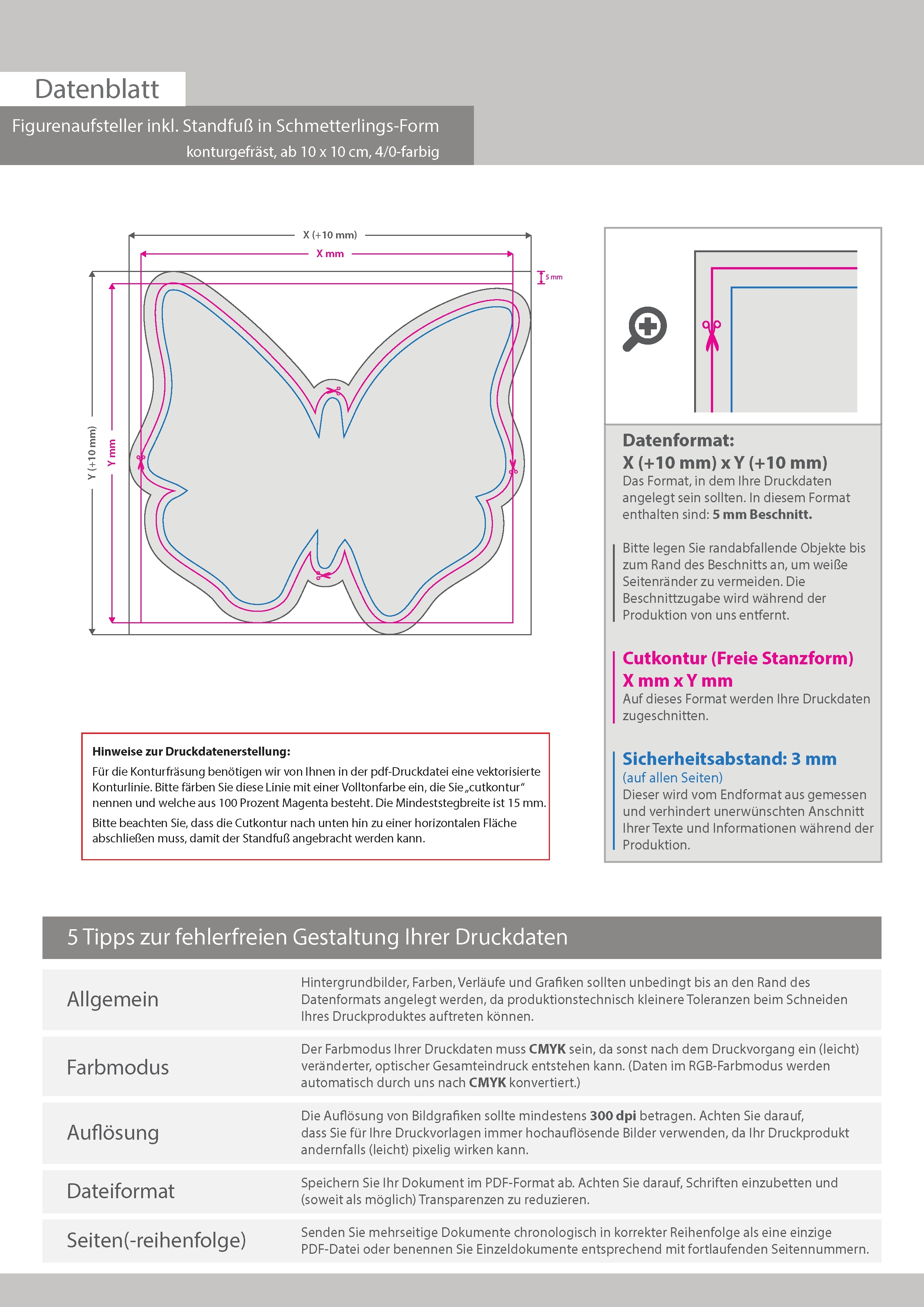 Figurenaufsteller inkl. Standfuß in Schmetterling-Form konturgefräst, ab 10 x 10 cm, einseitig 4/0-farbig bedruckt
