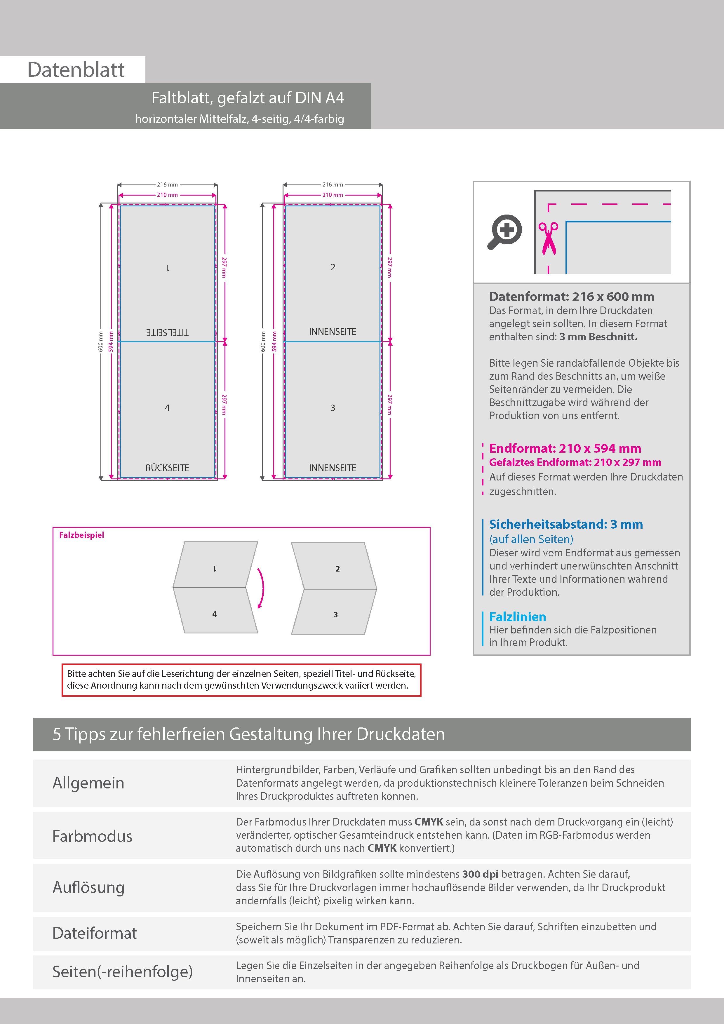 Faltblatt, gefalzt auf DIN A4, horizontaler Mittelfalz, 4-seitig