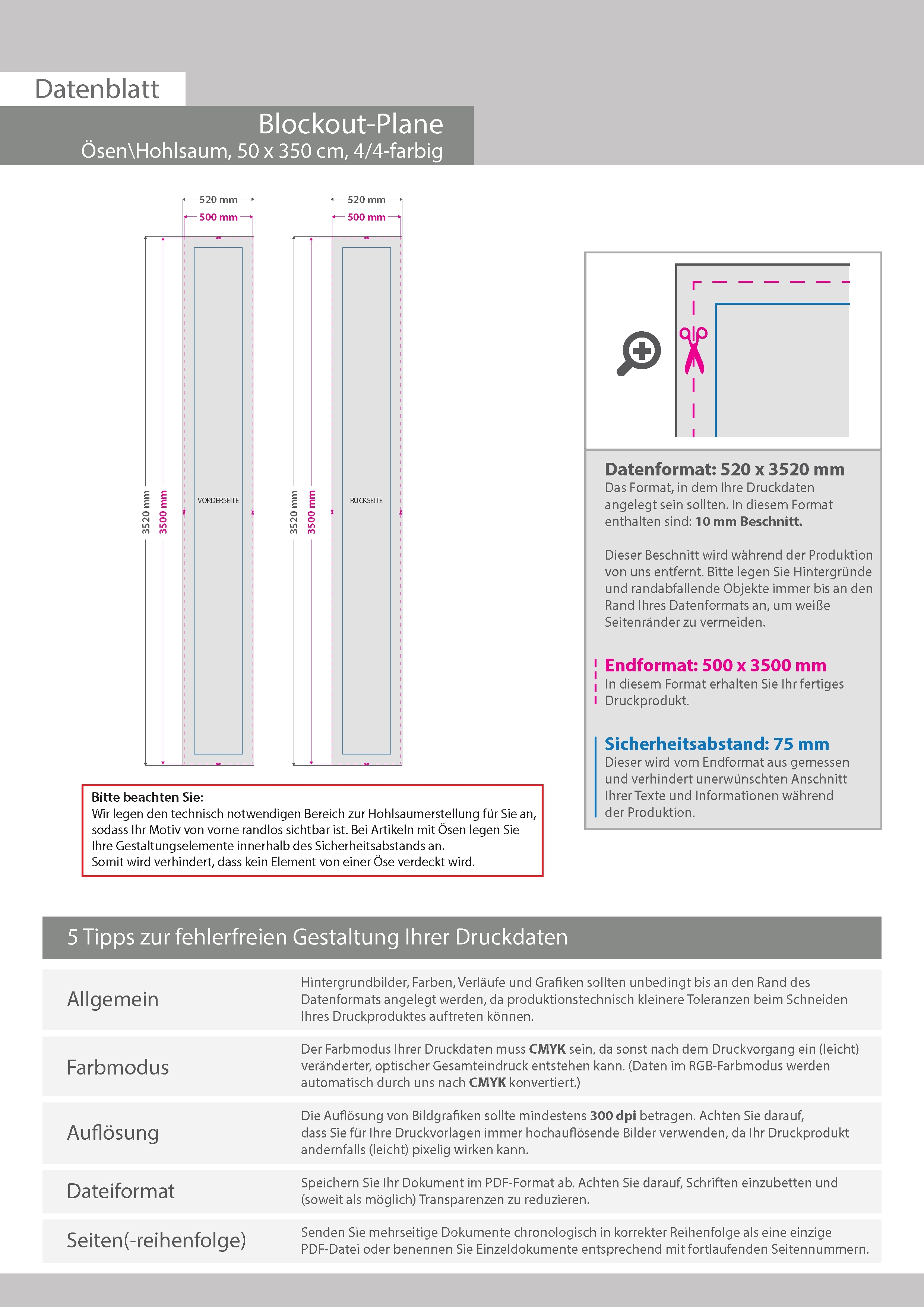Hochwertige Blockout-Plane 50 x 350 cm, 4/4-farbig bedruckt, Hohlsaum oben und unten (Durchmesser Hohlsaum 6,0 cm)