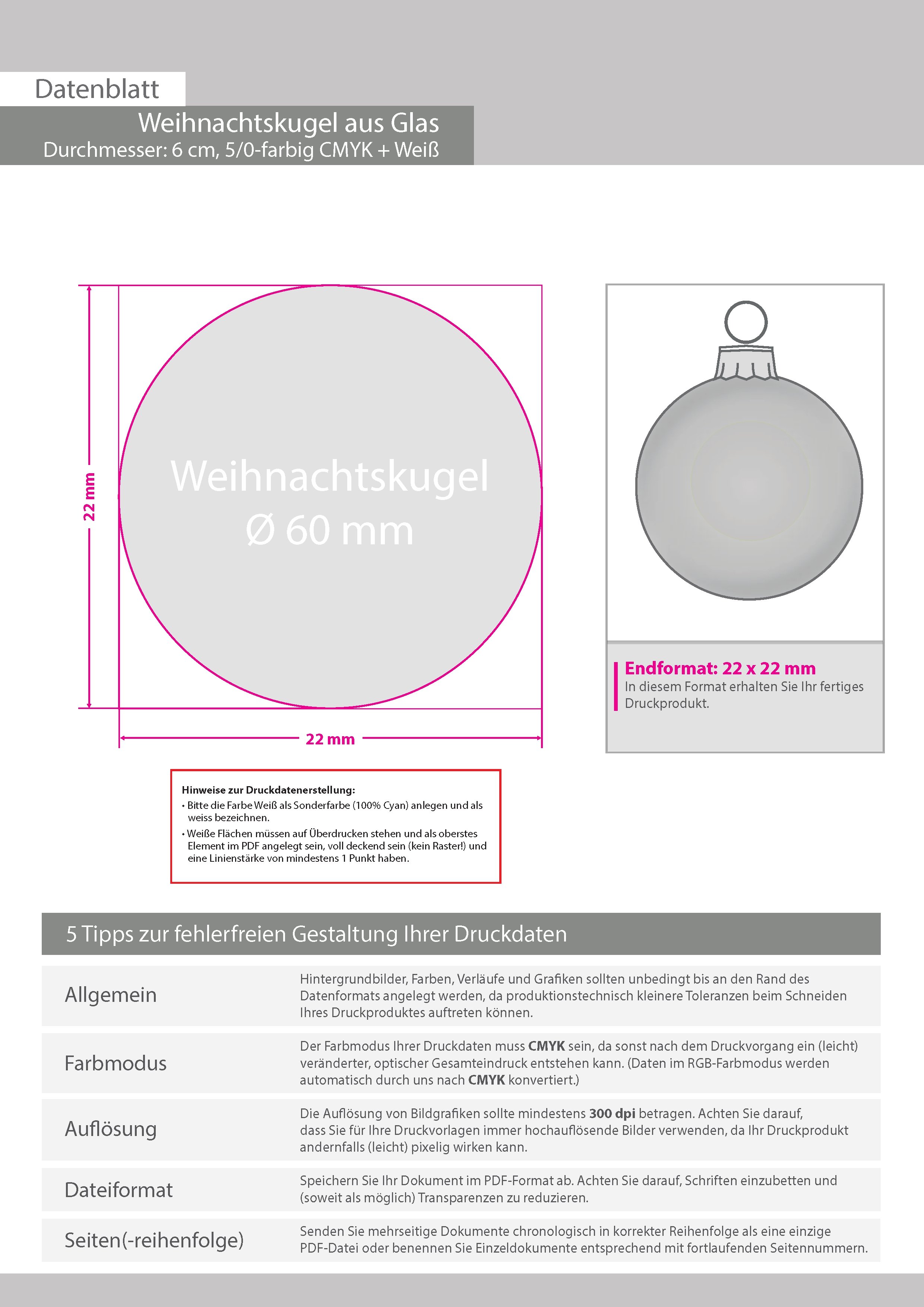 Weihnachtskugel aus Glas, Durchmesser: 6 cm, 5/0-farbig CMYK + Weiß einseitig bedruckt